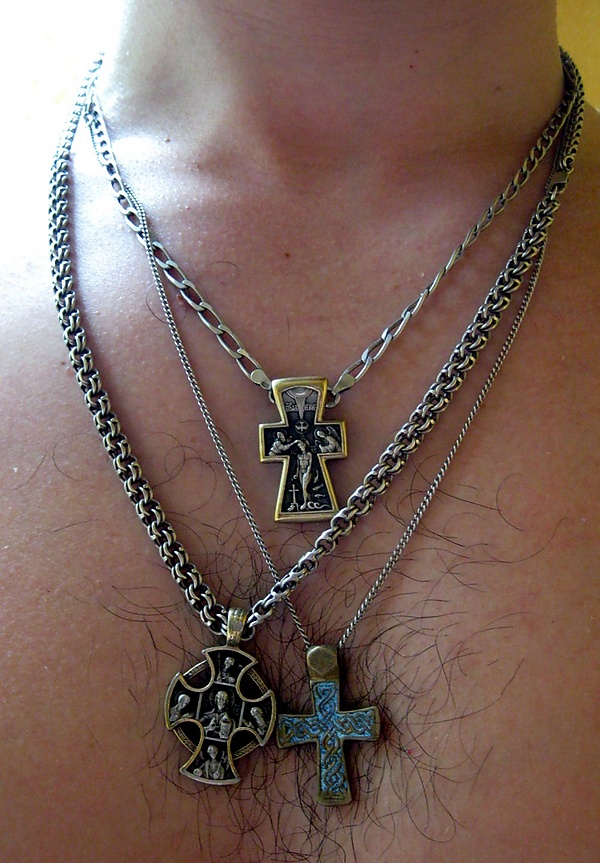 Разновидностью наперсного креста является нательный крестик. Нательный крест, «тельник» — распятие маленького размера, обычно получаемое человеком во время обряда крещения от крестных родителей. Носится под одеждой, не напоказ.[21] Нательный крест надевается на крещаемого во исполнение евангельских слов: «кто хочет идти за Мною, отвергнись себя, и возьми крест свой, и следуй за Мною» (Мк. 8:34). В русской православной традиции на обороте нательного креста обыкновенно помещают надпись «Спаси и сохрани».