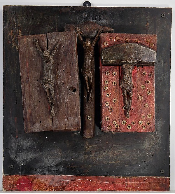 Композиция выполнена на деревянной основе с черным фоном и красной полосой в нижней части. Произведение состоит из трех частей. Слева на двух деревянных брусках изображена фигура распятого человека в набедреннике. Голова фигуры с длинными волосами наклонена к груди; отсутствует кисть левой руки. Справа на деревянных брусках, закрепленных винтами, представлена человеческая фигура в набедреннике, у которой вместо головы изображен молоток. В центре на молотке, прикрепленном к основе саморезами, находится фигура распятого человека, где голова с длинными волосами слегка наклонена к груди. Размер композиции составляет 40,3×37 см (края неровные).