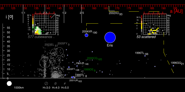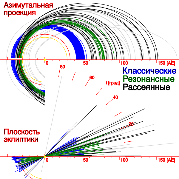 Графики слева в более традиционном виде представляют виды с полюса и эклиптики (спрямлённых) орбит объектов рассеянного диска[8] (чёрные) на фоне кьюбивано (синие) и резонансных (2:5) объектов (зелёные). Как ещё не классифицированные, объекты в диапазоне 50—100 а. е. нарисованы серым[9].
