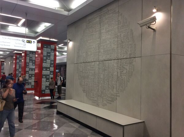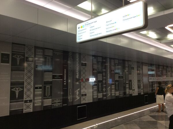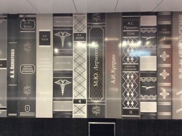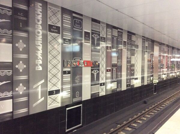Архитектурная концепция совмещает декораторский стиль ар-деко и пространство классического читального зала общественной библиотеки. Главные элементы интерьера — колонны, задекорированные под «шкафы-картотеку». На лицевой поверхности картотечных ящиков нанесены QR-коды. Пол станции выполнен в виде ромбовидного шахматного рисунка двух типов гранита: тёмно-серый с белым и светло-серый с белым. Путевые стены облицованы металлокерамическими панелями с рисунком в виде корешков книг, а простенки со скамейками для отдыха, расположенные между колонн, — цитатами известных людей[24]. Станция освещается светильниками правильной геометрической формы, а освещение вдоль путей сделано скрытым. Основания колонн и названия станции на путевых стенах также получили архитектурную подсветку[19].