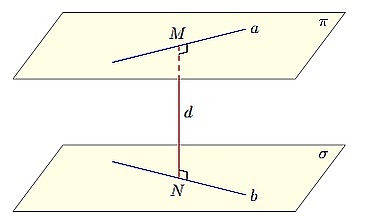 Величина d есть также расстояние от любой точки прямой a до плоскости σ (и вообще от любой точки плоскости π до плоскости σ). Поэтому если в поставленной задаче общий перпендикуляр к двум скрещивающимся прямым не просматривается, можно искать расстояние от какой-либо удобной точки первой прямой до плоскости, проходящей через вторую прямую параллельно первой прямой — это и будет расстояние между двумя данными скрещивающимися прямыми.