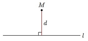 Если точка M не лежит на прямой, то расстояние от точки до прямой — это длина перпендикуляра d, проведённого из данной точки на данную прямую.