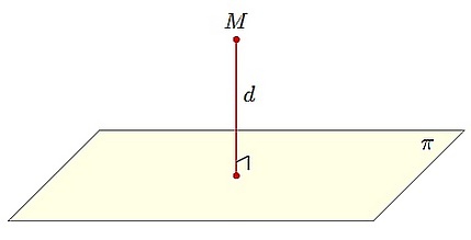 Если точка M не принадлежит плоскости, то расстояние от точки до плоскости — это длина перпендикуляра d, опущенного из точки на данную плоскость.