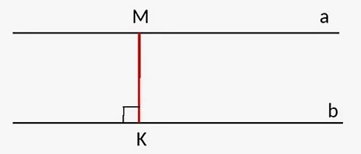 Все точки каждой из двух параллельных прямых равноудалены от другой прямой на расстояние, равное длине перпендикуляра MK, проведённого из произвольной точки на одной прямой к другой прямой.