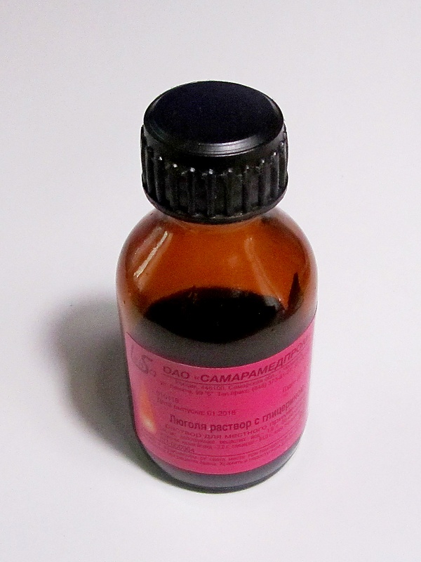 Раствор Люголя с глицерином обычно применяется для смазывания и орошения слизистых оболочек глотки и гортани для эффективного лечения ангины, хронического тонзилита и ангулярного стоматита (заедах). Препарат крайне эффективно подавляет стрептококковую инфекцию. Кратковременно вызывает неприятное ощущения жжения, хотя оно очень быстро проходит и компенсируется его высокой эффективностью и долгим временем действия. Противопоказан при нарушениях щитовидной железы[9].