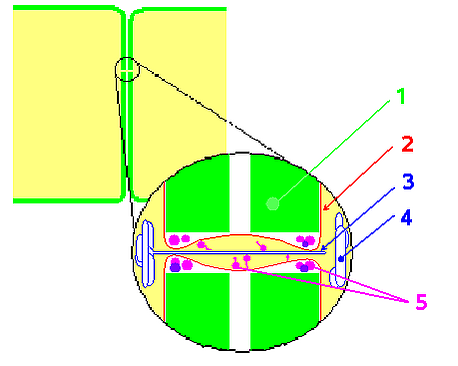 - Специализированные пути связи между клетками — плазмодесмы[3], цитоплазматические мостики: цитоплазма и эндоплазматический ретикулум (ЭПР) соседних клеток сообщаются через поры в клеточных стенках[4].