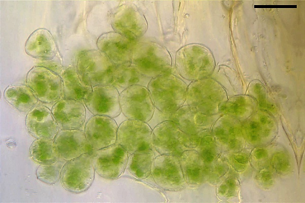 - Пластиды, из которых наиболее важны хлоропласты. Хлоропласты содержат хлорофилл, зелёный пигмент, поглощающий солнечный свет. В них осуществляется фотосинтез, в ходе которого клетка синтезирует органические вещества из неорганических. Другими пластидами являются лейкопласты: амилопласты, запасающие крахмал, элайопласты, хранящие жиры и др., а также хромопласты, специализирующиеся на синтезе и хранении пигментов. Как и митохондрии, чей геном у растений содержит 37 генов[5], пластиды имеют собственные геномы (пластомы), состоящие из около 100—120 уникальных генов[6]. Как предполагается, пластиды и митохондрии возникли как прокариотические эндосимбионты, поселившиеся в эукариотических клетках[7].