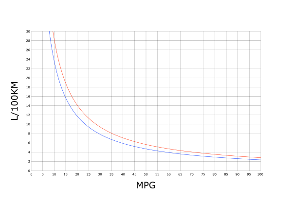 - дистанция, при прохождении которой автомобиль израсходует заданный объём топлива. Широко используется в странах с английской системой мер, где расход измеряется как количество миль, которое автомобиль может проехать на одном галлоне (британском или американском) топлива (миль/галлон, miles per gallon (MPG)). В Индии, Японии, Южной Корее экономичность измеряют в км на литр топлива. Чем значение больше, тем экономичней автомобиль.
