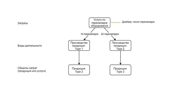 В противовес таким подходам, Activity-Based Costing предложил распределять затраты пропорционально так называемым "драйверам" - показателям реального использования затрат в разных процессах. Драйверами могут быть: часы работы оборудования; количество произведенных переналадок и другие физические величины, отражающие физические процессы использования ресурсов. Общая схема учета по ABC выглядит так (пример на рис. 1-2):