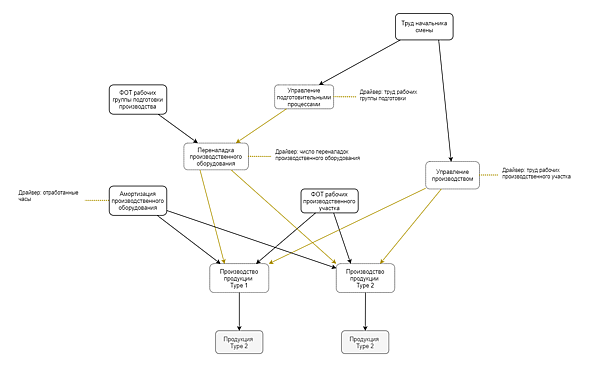 Тем не менее, известны случаи, когда на практике, по мере построения системы ABC, она усложняется, и предпринимаются попытки выстраивать многоуровневые зависимости между драйверами. Например, в дополнение к затратам основного производственного подразделения, на его процессы могут пропорционально распределяться затраты вспомогательных производственных подразделений (см. рис. 3).