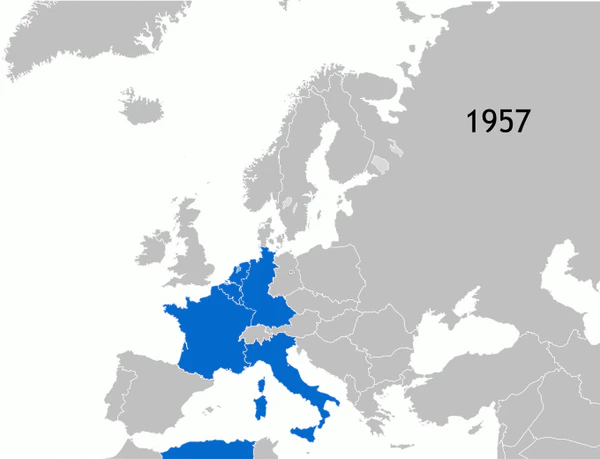 Европейское объединение угля и стали было предложено Робером Шуманом в его заявлении от 9 мая 1950 года и вызвало объединение угольных и сталелитейных промышленностей Франции и Западной Германии. К этому проекту присоединились «страны Бенилюкса» — Бельгия, Люксембург и Нидерланды, которые уже достигли некоторой степени интеграции между собой. К этим странам присоединилась Италия, и все они подписали 23 июля 1952 года Парижский договор. Эти шесть стран, получившие название «Внутренние шесть» (в противоположность «Внешним семи», которые сформировали Европейскую ассоциацию свободной торговли и с подозрительностью отнеслись к интеграции), пошли ещё дальше. В 1957 году они подписали в Риме договор, положивший основание двум сообществам, вместе известным как «Европейские сообщества» после слияния их руководства.