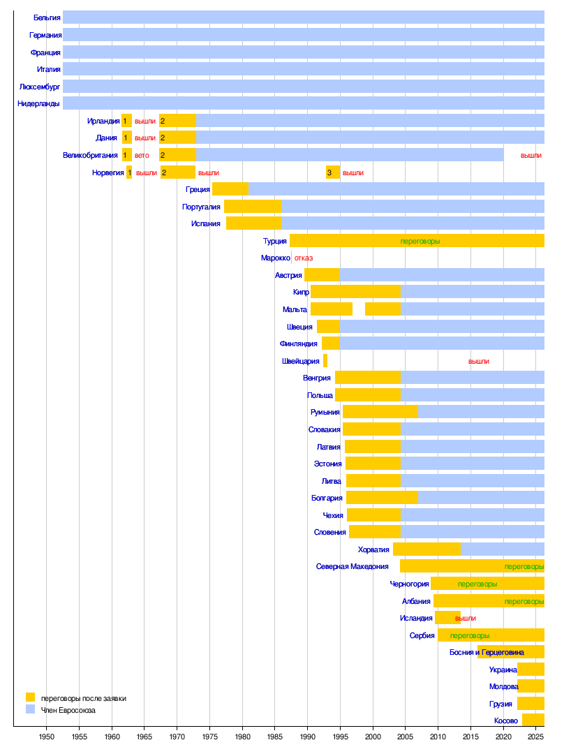 | * Заявки в Европейское объединение угля и стали, Европейские сообщества и Европейский союз в зависимости от даты. | ||