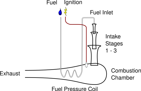 Не имея движущихся частей, двигатель работает благодаря наличию гибкой трубы в камере сгорания, которая перегревает топливо (пропан) перед впрыском в воздушно-топливный канал. В камере сгорания топливно-воздушная смесь воспламеняется и сгорает, создавая тягу при выходе через выхлопную трубу. Всасывание и сжатие топливно-воздушной смеси происходит под давлением пропана при его впрыске, а также под действием звуковых волн, создаваемых сгоранием и воздействующих на впускные трубы[2].