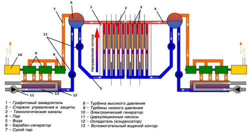 Реактор РБМК работает по одноконтурной схеме. Циркуляция теплоносителя осуществляется в контуре многократной принудительной циркуляции (КМПЦ). В активной зоне вода, охлаждающая твэлы, частично испаряется и образующаяся пароводяная смесь поступает в барабаны-сепараторы. В барабан-сепараторах происходит сепарация пара, который поступает на турбоагрегат. Остающаяся вода смешивается с питательной водой и с помощью главных циркуляционных насосов (ГЦН) подаётся в активную зону реактора. Отсепарированный насыщенный пар (температура ~284 °C) под давлением 70—65 кгс/см2 поступает на два турбогенератора электрической мощностью по 500 МВт. Отработанный пар конденсируется, после чего, пройдя через регенеративные подогреватели и деаэратор, подаётся с помощью питательных насосов (ПЭН) в КМПЦ.