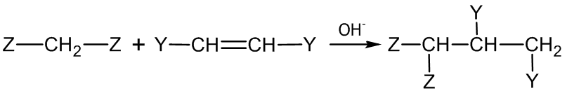 Нуклеофильное присоединение по связи С=C встречается достаточно редко, и, как правило, если в соединении имеются электроноакцепторные заместители[3]. Наибольшее значение имеет в этом классе реакция Михаэля[4]: