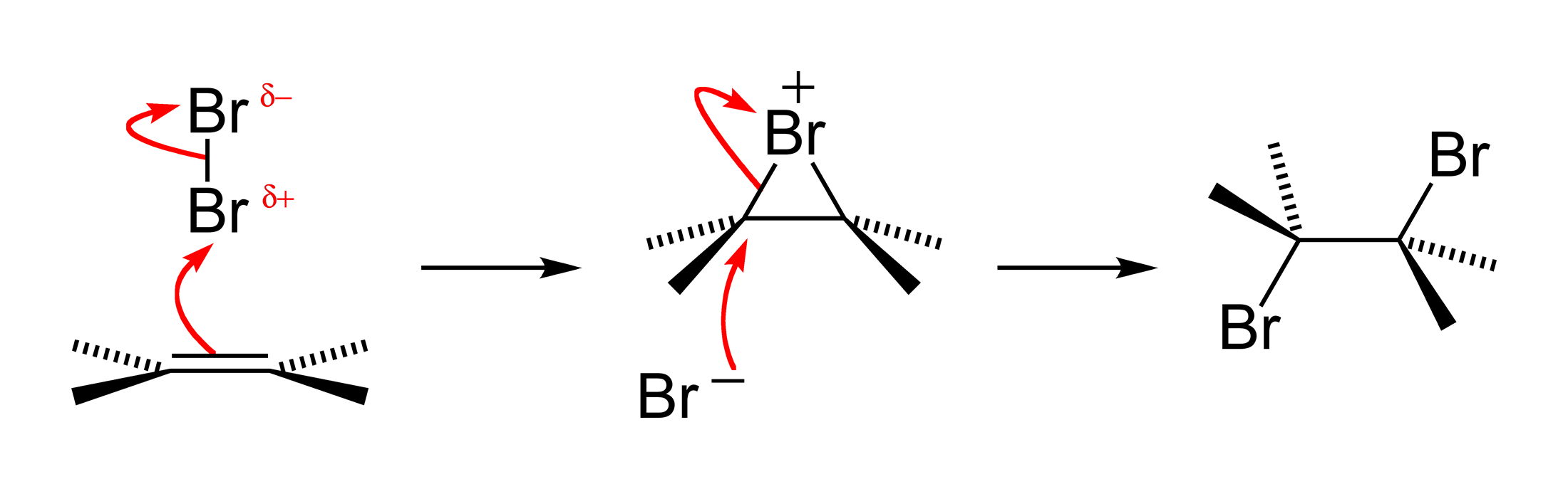 Присоединение брома — анти-присоединение, то есть присоединение с противоположной стороны, относительно плоскости молекулы алкена[3]. Это весьма наглядно представляется с помощью формул Ньюмена.