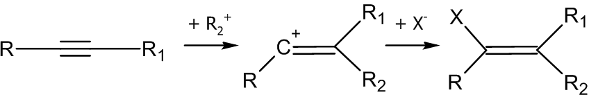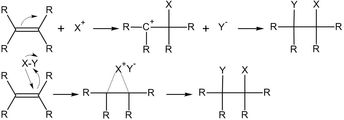 Электрофильное присоединение по кратной связи обычно двухстадийный процесс AdE2 — реакция бимолекулярного электрофильного присоединения (англ. addition electrophilic bimolecular). На первом этапе происходит атака электрофила и образование π-комплекса, который затем расщепляется, а далее образовавшийся карбкатион подвергается нуклеофильной атаке[1]: