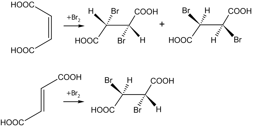 Подтверждение данного механизма обнаруживается при исследовании бромирования малеиновой и фумаровой кислот.