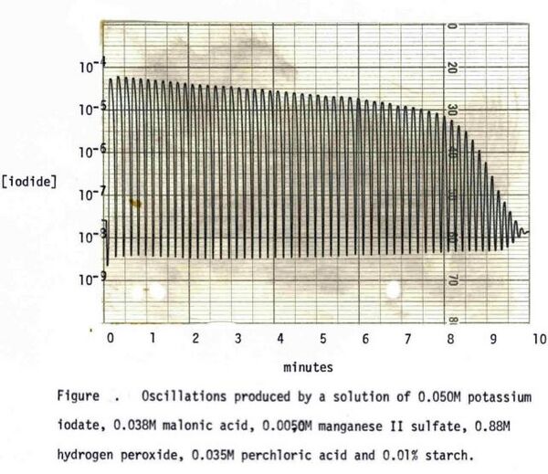Исходный водный раствор содержит перекись водорода, иодат, двухвалентный марганец (Mn2+) в качестве катализатора, сильную инертную кислоту (серную (H2SO4 ) или хлорную (HClO4) кислоту) и органическое соединение с активным («енольным») атомом водорода, соединённым с углеродом, который будет медленно восстанавливать свободный иод (I2) до иодида (I-).