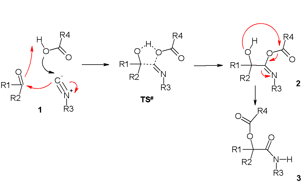 В полярных растворителях, таких как метанол или вода, реакция происходит через протонирование карбонильной группы и последующего нуклеофильного присоединения изоцианида с образованием нитрилиевой соли (алкилированного циангидрина) 3. Присоединение карбоксилат-аниона даёт интермедиат 4. Перенос ацильной группировки и таутомеризация амидной приводит к образованию требуемого сложного эфира 5.