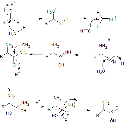 В начале реакции карбонильный атом углерода подвергается нуклеофильной атаке со стороны молекулы аммиака. В результате данной атаки образуется неустойчивое соединение, содержащее протонированную гидроксильную группу. Оно отщепляет молекулу воды, переходя в ион иминия. В свою очередь ион иминия подвергается атаке со стороны цианид-иона, в результате чего образуется аминонитрил.