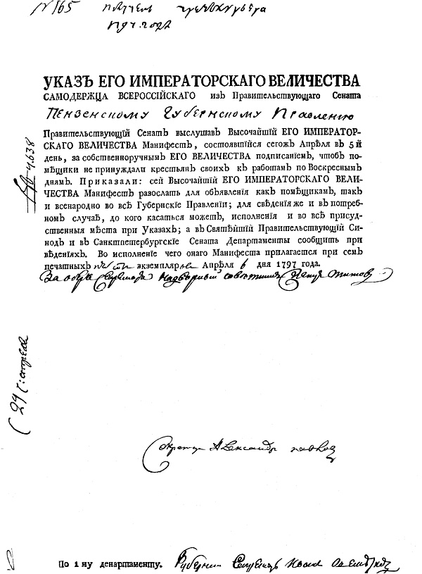 В основном крестьянские жалобы касались того, что помещики по-прежнему заставляют их работать по воскресным дням. Так, крестьяне Гжатского уезда Смоленской губернии просили у Павла I защиты от помещичьих поборов и работ в праздничные дни[15]. Крестьянин Аршадского уезда Смоленской губернии Леон Фролов взывал к государю: «а как есть от Вашего Императорского Величества запрещено в воскресные дни работать и почитать их праздниками, а мы и единого дня не проводим без господской работы»[16]. Рязанский губернатор М. И. Коваленский рапортовал генерал-прокурору А. Б. Куракину, что крестьянин Марк Тихонов, принадлежащий помещику М. К. Фролову, «показал на помещика своего, что он посылал его, Тихонова, на работу в воскресный день, и когда он, не послушав, объявил ему, Фролову, что в воскресные дни работать запрещено, то он, Фролов, порочил якобы указ бранными словами»[17]. Крепостные Владимирской губернии, жалуясь государю на невыносимо высокие размеры барщины и оброка, сообщали, что помещик «даже и воскресного дня не даёт нам на себя работать, отчего и приходим в крайнее разорение и бедность, и пропитание имеем милостынею» (из-за нехватки времени для работы на своём хозяйстве у них часто пропадал урожай, и они были вынуждены просить милостыню в соседних сёлах)[18].