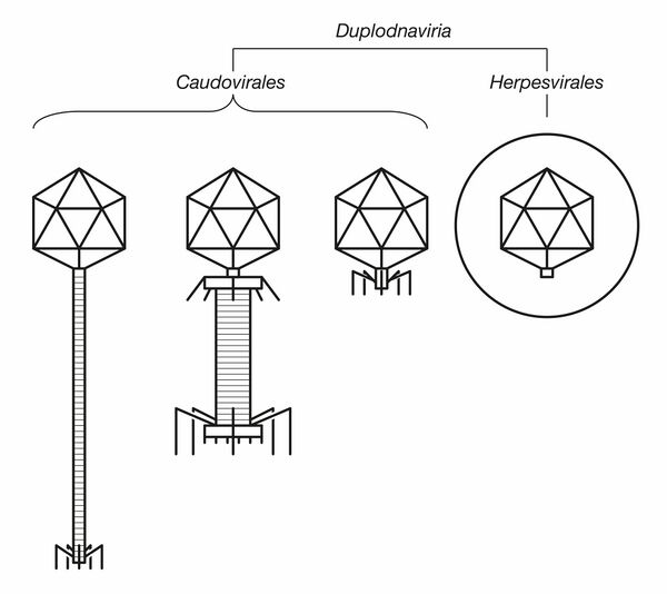 Связь между Caudovirales и Herpesvirales не определена, поскольку они могут либо иметь общего предка, либо Herpesvirales может быть кладой внутри Caudovirales. Общей чертой, характерной для Duplodnaviria является то, что они вызывают латентные инфекции без репликации, но при этом способны реплицироваться в будущем[9][10]. Caudovirales широко распространены во всем мире[11], они играют важную роль в морской экологии[12] и являются темой многих исследований[13]. Известно, что вирусы герпеса вызывают различные кожные заболевания, включая простой герпес, ветряную оспу и опоясывающий лишай, а также саркому Капоши[14][15][16].