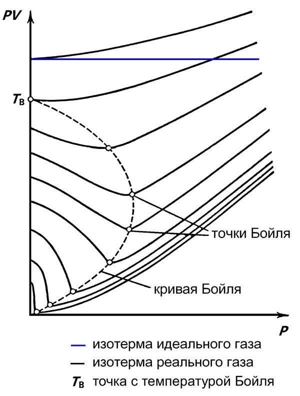 Из -диаграммы видно, что начальный участок изотермы с температурой Бойля, соответствующий сравнительно невысоким давлениям, достаточно близок к горизонтальной прямой, то есть при температуре газа, равной или близкой к температуре Бойля, реальный газ обладает свойствами, близкими к свойствам идеального газа[7][15].