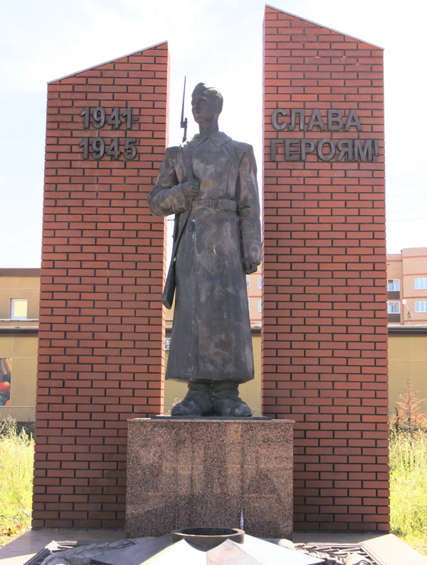 Композицию украшают установленная на постаменте трёхметровая фигура солдата с винтовкой на плече, и мемориальная доска, на которой выгравированы 39 фамилий погибших в войну работников завода[3].