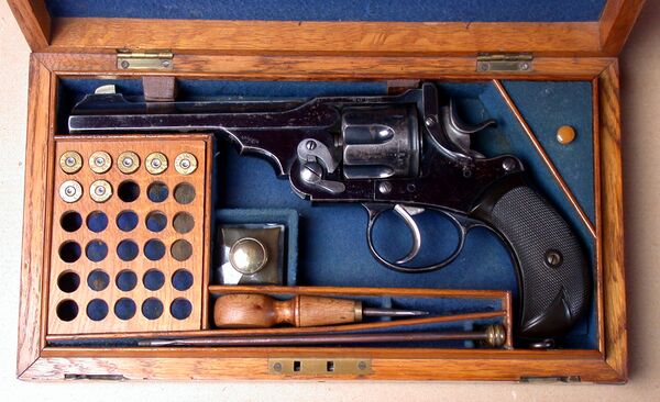 Британская компания Webley & Scott с середины XIX века и до конца XX века производила разнообразные револьверы. В 1853 году П. и Дж. Уэбли начали производство первых запатентованных револьверов одиночного действия. Уже под именем «P. Webley & Son» компания изготавливала собственные револьверы под патроны 44-го калибра центрального воспламенения, равно как и лицензионные копии револьверов Smith & Wesson. Револьверы Webley под патрон центрального воспламенения с шарнирной рамой стали самой известной продукцией компании: они производились с 1870-х годов. В 1877 году была выпущена модель «Webley-Pryse», в 1881 году — «Webley-Kaufmann»[8]. С 1885 до начала XX века производились модели W.G. или «Webley-Government», самые популярные револьверы с переломной рамой под патрон .476/.455. Они состояли на вооружении британских офицеров. Однако не меньшую популярность сыскали и револьверы ирландской полиции «Webley RIC», и револьверы «Bull Dog», которые можно было носить в кармане пальто и применять для самообороны[9][10].