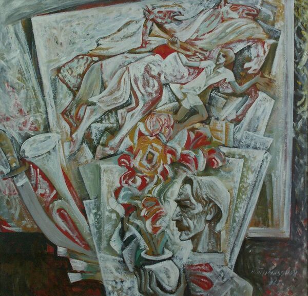 На полотне изображён интерьерный натюрморт. На переднем плане справа располагается бюст мужчины до пояса в профиль, рядом с которым стоит ваза с цветами. Слева на столе находятся кисти, горн и шашка; фон картины занимает изображение конницы. В нижнем правом углу холста выполнена подпись «Н. Третьяков 82 г.». На обороте в верхнем левом углу указаны размеры «97 × 100,5», год создания «1982 г.» и заглавие «Революционный натюрморт».