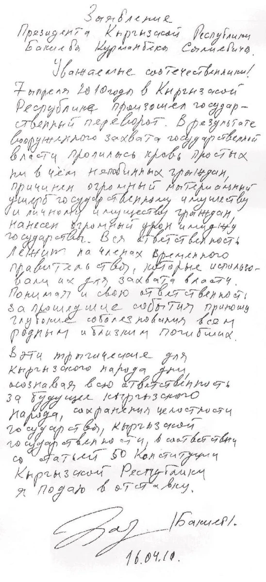 «Дорогие друзья, дамы и господа. Мой народ переживает страшную трагедию. Банда самозванцев объявила себя властью и творит беспредел, убивает мирных людей, разрушает жилища. Грабёж и насилие стали нормой жизни. Страна отброшена на десятки лет назад. Я, как президент и как гарант Конституции Кыргызстана, не снимаю с себя ответственность за катастрофу, которую переживает мой народ, и готов ответить за это по закону. Но это не значит, что я могу подчиниться бандитам и бросить свой народ в беде. В этой связи я заявляю следующее.