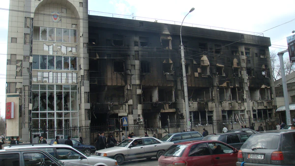 Было разгромлено здание парламента и подожжено здание Генеральной прокуратуры. Толпа захватила здание телецентра. Была изменена запланированная программа передач и начался «прямой эфир» с участием сотрудников неправительственных организаций и правозащитников. Затем бывший председатель парламента Омурбек Текебаев заявил в эфире, что «власть полностью перешла в руки народа» и объявил о назначении комендантом Бишкека полковника милиции в отставке Турата Мадалбекова[17][18][19][20].