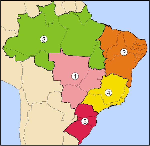 | Центрально-западный регион | 13,6 | 1612 | Бразилиа | Федеральный округ и 3 штата: Гояс, Мату-Гросу, Мату-Гросу-ду-Сул |