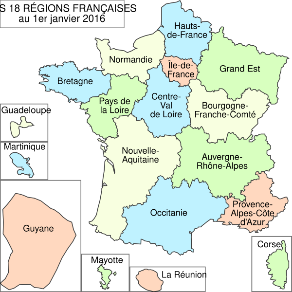 В 2014 году Парламент Франции (Национальное собрание Франции и Сенат) подписали закон (опубликован 16 января 2015 г.)[2][3], который сократил количество регионов Франции с 22 до 13. Новое территориальное деление вступило в силу с 1 января 2016 года[4].