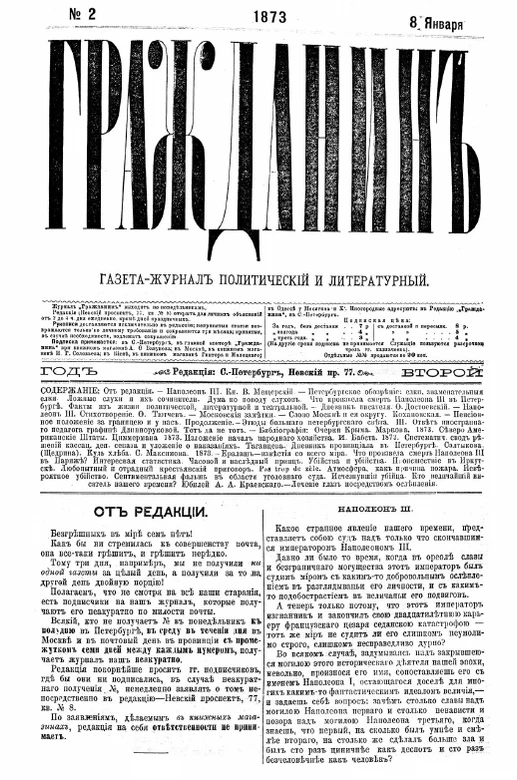 Также в 1870-х годах Фёдор Достоевский работал главным редактором в журнале Владимира Мещерского «Гражданин». Там он писал и правил редакционные статьи, в том числе объявления редакции о подписке на еженедельник[2].