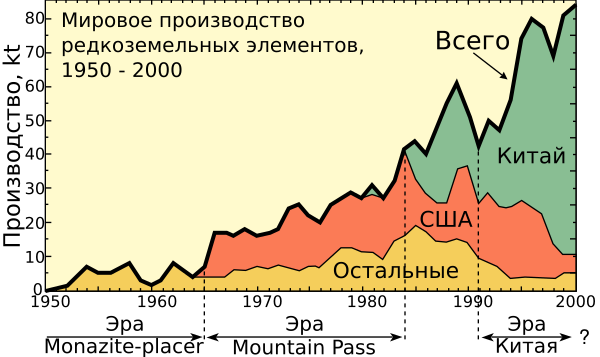 До начала 1990-х годов основным производителем были США[5] (месторождение Маунтин-Пасс). В 1986 году в мире произвели 36500 тонн оксидов редкоземельных металлов. Из них в США 17 000 тонн, СССР 8 500 тонн, Китай 6 000 тонн. В 1990-х годах в Китае происходит модернизация отрасли с участием государства. С середины 1990-х годов КНР становится крупнейшим производителем. В 2007—2008 годах в мире добывалось по 124 тыс. тонн редкоземельных элементов в год. Лидировал Китай, добывая до 120 тыс. тонн на месторождении Баян-Обо, принадлежащем государственной компании Inner Mongolia Baotou Steel Rare-Earth. В Индии 2 700 тонн, Бразилии 650 тонн. В 2010-х годах Китай проводит политику ограничения добычи и экспорта редкоземельных металлов, что стимулировало рост цен и активизацию добычи в других странах[6].