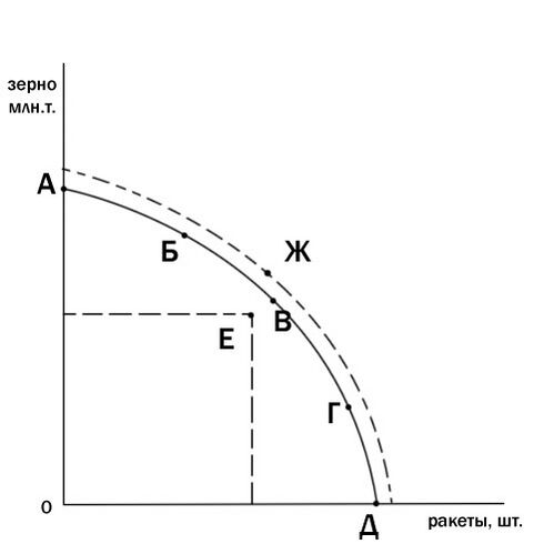 При решении проблемы ограниченности ресурсов и безграничности потребностей возникает выбор: какие потребности требуют немедленного удовлетворения, какие можно отложить, а от каких отказаться. В ходе выбора возникает альтернативная стоимость — эта стоимость наилучшая из упущенных возможностей, которая обладает большей ценностью. Графически выбор иллюстрируется кривой производственных возможностей (сокращённо КПВ). Альтернативная стоимость растёт в результате убывания производительностей ресурсов. КПВ всегда выпукла от начала координат, так как характеризуется ростом альтернативных издержек. Если точки лежат на кривой, то это эффективное производство, так как затрачиваются все ресурсы. Точка Е характеризует неэффективное производство, ввиду не использования части ресурсов, Ж — невозможный объём производства. КПВ может изменить своё положение, если: