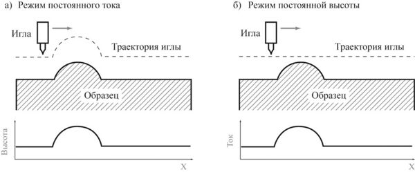 Режим постоянного тока — наиболее часто используемый режим получения картин СТМ. В этом режиме игла движется вдоль поверхности образца при постоянных значениях напряжения и тока. Для поддержания постоянной величины тока при фиксированном напряжении система слежения постоянно подстраивает вертикальное положение иглы, варьируя напряжение Vz на z-пьезоэлектрическом элементе. В идеальном случае гомогенной (с электронной точки зрения) поверхности постоянство тока означает неизменность величины промежутка между иглой и поверхностью, т. е. в ходе сканирования траектория иглы повторяет все особенности топографии поверхности (рис. а). Высоту элементов рельефа поверхности прямо определяют из величины Vz. В результате таких измерений получают значения высоты рельефа поверхности как функции положения иглы z(x, y).