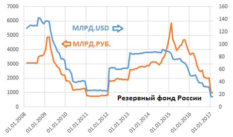 При этом, вопреки популярному заблуждению, рост или падение Резервного фонда не означали автоматически роста или падения ЗВР РФ, который имеет и другие активы с собственной динамикой, отличной от Резервного фонда[4]. Так, ЗВР России с июня 2015 до июня 2017 годов выросли с 316 до 412 млрд $[5], при этом за этот же период Резервный фонд как часть ЗВР сократился с 76 до 16 млрд $[6]. Таким образом, другие активы ЗВР РФ росли намного быстрее, чем сокращался Резервный фонд[4].