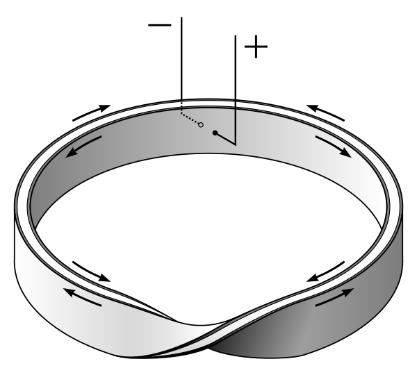 Два ленточных проводника одинаковой длины прикреплены на противоположных сторонах полосы диэлектрика. Затем сборке придается один поворот, и концы соединяются, образуя поверхность Мебиуса. Концы проводников спаяны вместе, а выводы резисторов присоединены к прямо противоположным паяным соединениям. Ток, подаваемый на клеммы, будет распространяться в противоположных направлениях, так что электромагнитные поля нейтрализуют друг друга, в результате чего получается по существу неиндуктивный, нереактивный резистор с низкой постоянной времени[3].