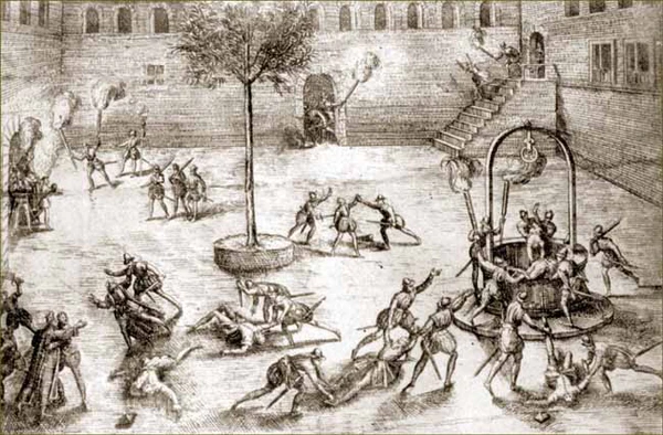 В 1567 году нимские гугеноты, в ярости от того, что в мае их кандидат на пост сенешаля, протестант капитан Ла-Грий (La Grille), был отвергнут лангедокским наместником Монморанси и что их культ преследовался в пригородах, на Михайлов день (время осенней городской ярмарки) собрали во дворе епископского дворца важнейших лиц католического вероисповедания и, убив их, сбросили тела там же в колодец. Число жертв — от 80 до 90 человек.