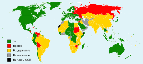 «За» соответствующую резолюцию проголосовали 100 стран — членов ООН, включая авторов постановления[28][29]: