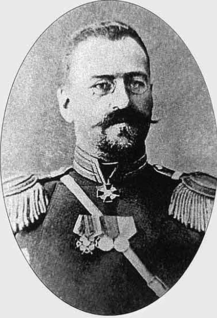 «Это был плотный, немного склонный даже к полноте мужчина с навощенными кончиками усов и в пенсне с золотой оправой. Стекла этого пенсне скрывали пару серых оловянных глаз с пронзительным, тяжелым взором. Несмотря на его подчеркнутую постоянную любезность, взгляд этих металлических глаз всегда распространял вокруг него какой-то холодок».[3]