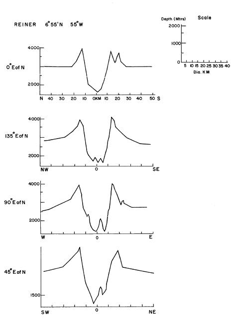 На приведенном графике представлено сечение кратера в различных направлениях[5], масштаб по оси ординат указан в футах, масштаб в метрах указан в верхней правой части иллюстрации.