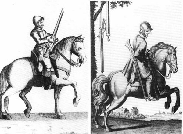 Интересно, что изначально такую тактику часто применяли и кирасиры, тоже имевшие по паре пистолетов в качестве вспомогательного вооружения. Но в ходе Тридцатилетней войны кирасиры постепенно от неё отказались, так как она мешала немедленному вступлению в ближний бой. При атаке во фланг или в тыл вступление в перестрелку вместо начала ближнего боя приводило к потере эффекта неожиданности, давая пехоте время подготовиться к кавалерийской атаке.
