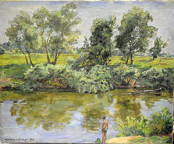 В центре композиции летнего пейзажа изображена гладь воды неширокой реки. Справа на переднем плане расположен фрагмент песчаного берега с кустарниками и фигурой мальчика-подростка, показанного со спины. На реке, ближе к противоположному берегу, находится лодка, в которой стоит мужчина с шестом. По другому берегу тянутся кусты, выше располагаются деревья, за которыми простирается луг. На дальнем плане среди зелени схематично обозначены фрагменты деревенских домиков, скрывающихся между деревьями.