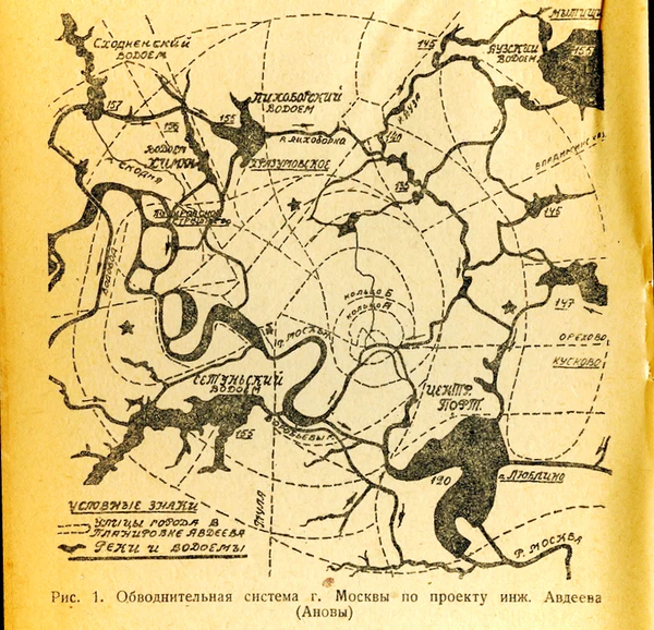 Все эти факторы привели к созданию плана обводнения Москвы — нового комплекса мер по решению проблем города с водоснабжением и судоходством[22]. План был принят 15 июня 1931 года постановлением пленума ЦК ВКП(б) по докладу Лазаря Моисеевича Кагановича[23][24]. План предлагал создать в столице два водных кольца из волжской воды. Внешнее кольцо должно было идти от Клязьминского водохранилища по Восточному каналу через Измайловский парк, Текстильщики и Южный порт у Кожухово по Москва-реке к Химкинскому водохранилищу. Внутригородское кольцо получалось бы в результате создания Северного канала, соединяющего Химкинское водохранилище с рекой Яузой[25].