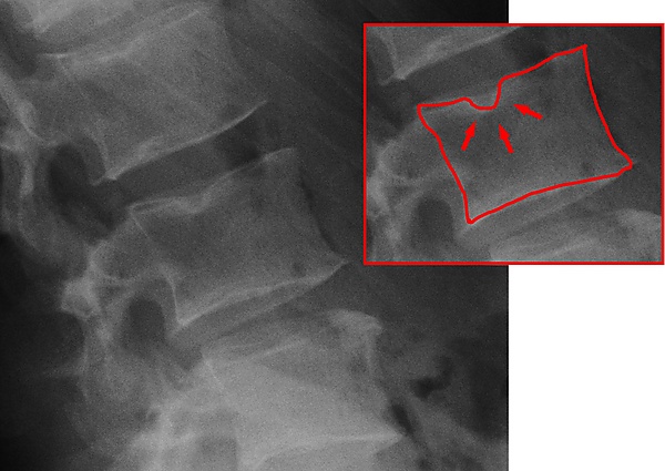 Сжимающие силы, воздействующие на позвоночник в результате механической нагрузки, часто вызывают грыжу диска. В свою очередь, это способствует образованию кистозных образований, называемых узлами Шморля, на верхней и нижней концевых пластинах позвонков[12].
