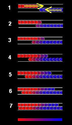 Фактически происходит обычный теплообмен между телами, которые в процессе своего встречного движения непрерывно меняют взаимодействующий с ними объект. Теплообмен уравновешивает температуру в каждой точке вдоль трубы(см. рисунок), но за счёт встречного движения, охлаждающее тело в начале своего движения взаимодействует с уже достаточно охлаждённым нагревающим телом, и наоборот.